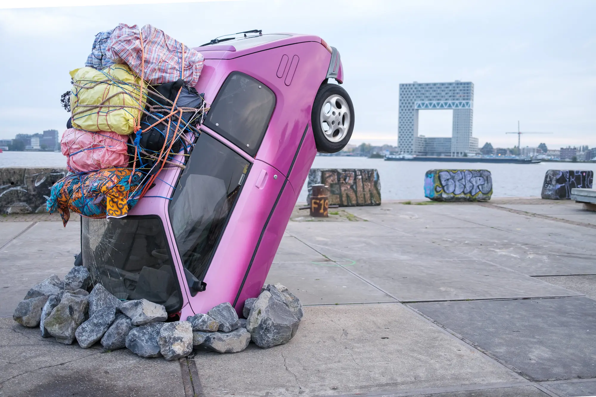 Het lijkt alsof deze auto met een flinke klap is geland. De installatie Landed Rock (Gelande rots) van ontwerper en beeldend kunstenaar Clinton Kabena gaat over migratie. In 2022 waren wereldwijd meer dan 100 miljoen mensen op de vlucht voor oorlog en geweld. Zij vestigen zich meestal in een omgeving ver weg van huis, die voor hen onbekend en nieuw is. Kabena is gefascineerd door deze crash in een andere cultuur. Naast de gecrashte auto zijn op de drie NDSM Billboards visuals te zien die reageren op het onderwerp "grenzen".