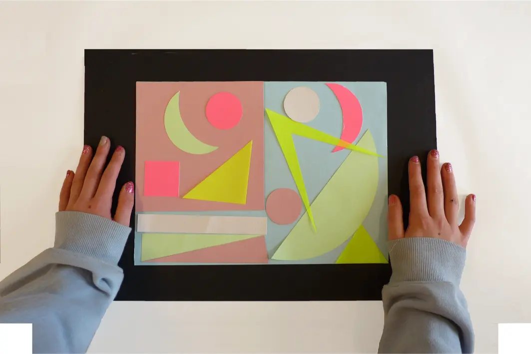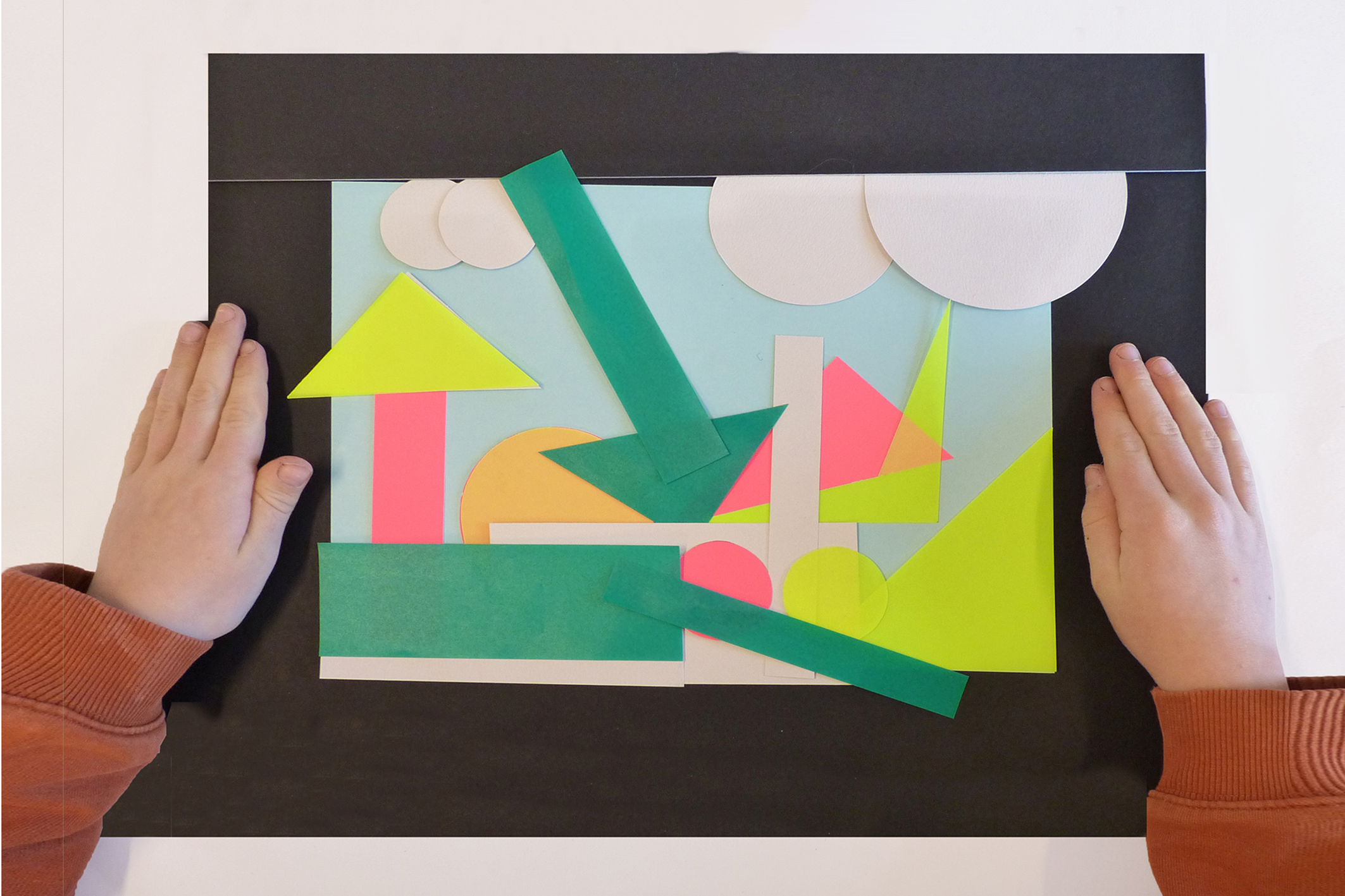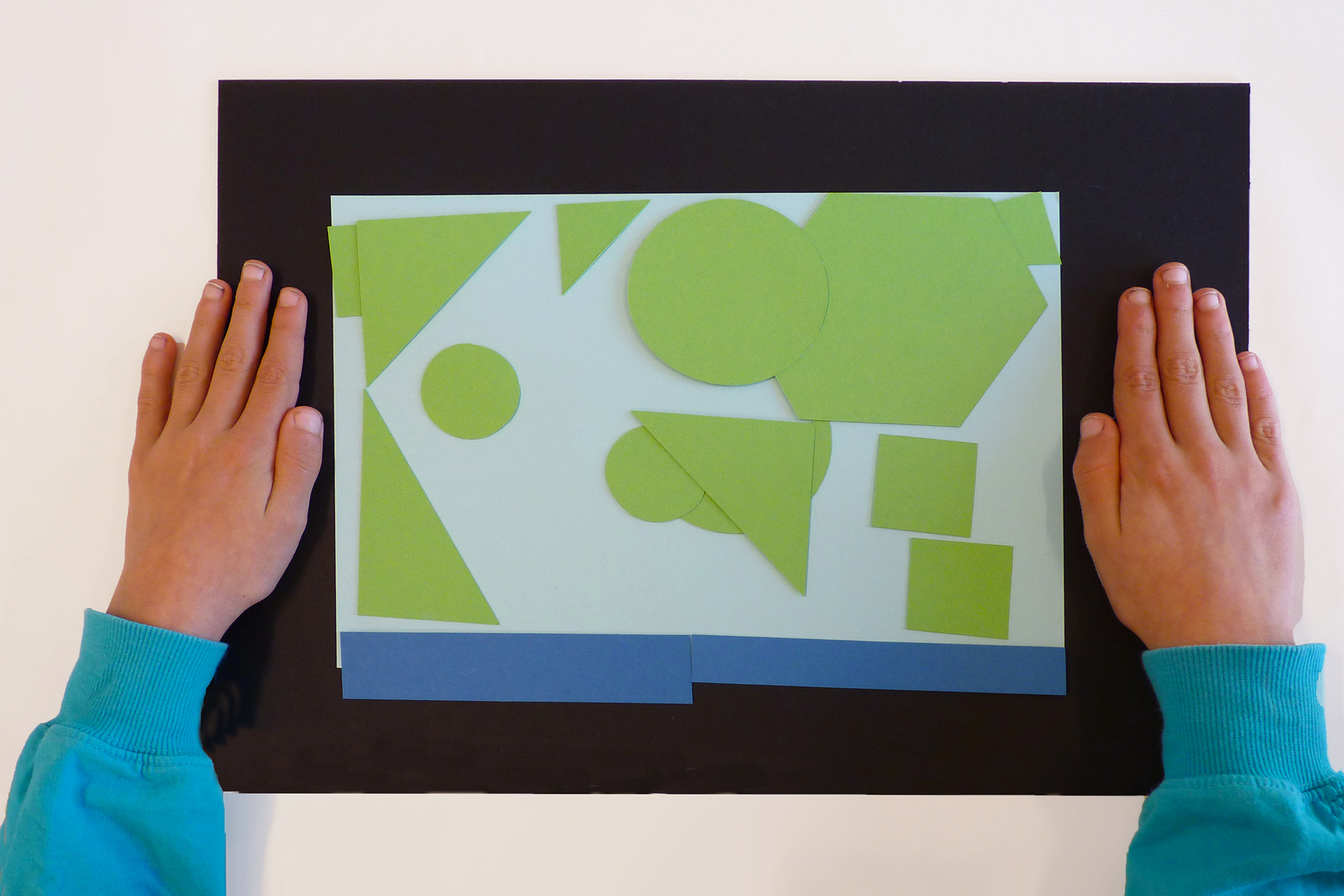 Explanation: Green is for nature. The blue for the water and the pink for the houses. The background is light blue, but that's a surprise. On the side, yellow and pink turn orange together, I like that too.